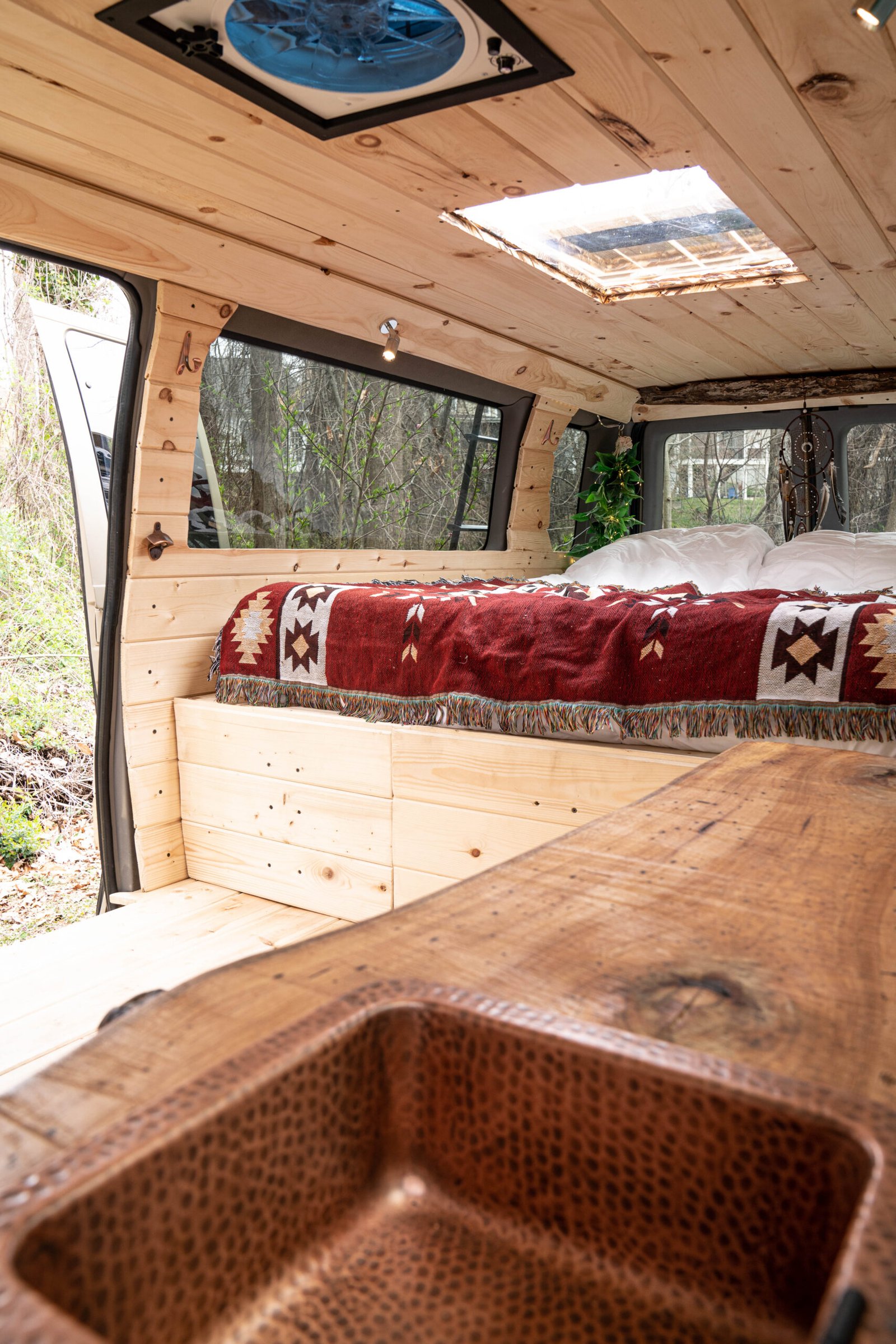 Step inside, and the scent of timber and earth fills the air, a cabin built from wood and wanderlust. Pine-paneled walls hold the warmth of the sun, the whispers of old forests, the stories of places left behind. A live-edge countertop, smooth as river stone, waits for slow morning coffees and late-night conversations. Plants hang from the windows, swaying with every bend in the road, a reminder that even in motion, you can still put down roots.